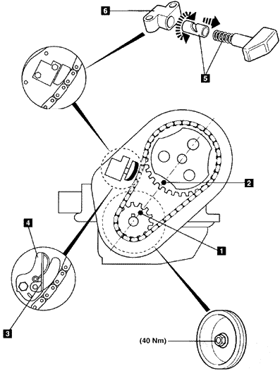 3.安装正时链和曲轴链轮,并确保正时标记1和2对齐。