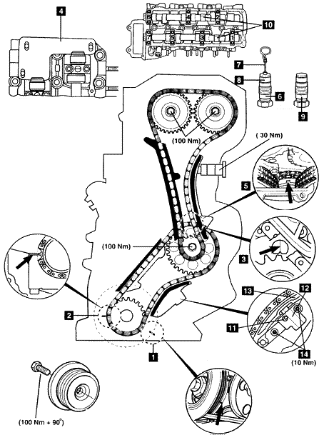 7.早期发动机上的凸轮轴由复式正时链驱动,安装前必须对张紧器6进行排气:
