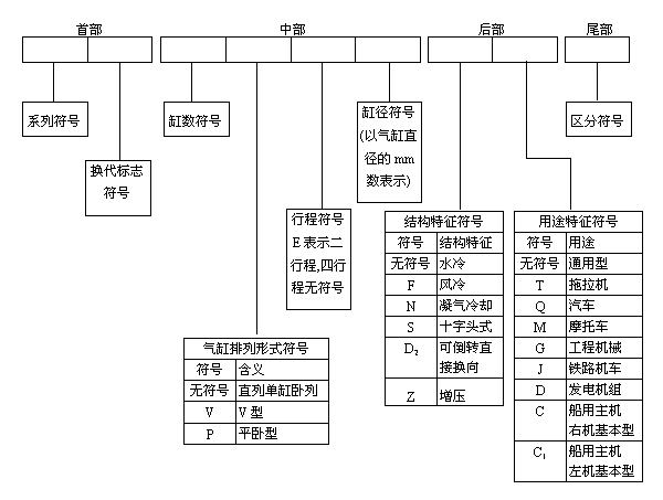 中部:由缸数符号、冲程符号、气缸排列形式符号和缸径符号等组成。 后部:结构特征和用途特征符号,以字母表示。