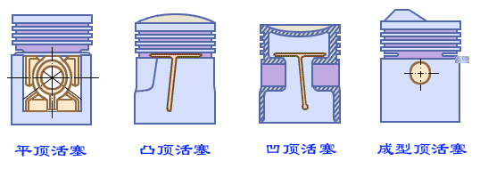 活塞顶部承受气体压力,它是燃烧室的组成部分,其形状、位置、大小都和燃烧室的具体形式有关,都是为满足可燃混合气形成和燃烧的要求,其顶部形状可分为四大类,平顶活塞、凸顶活塞、凹顶活塞和成型顶活塞。