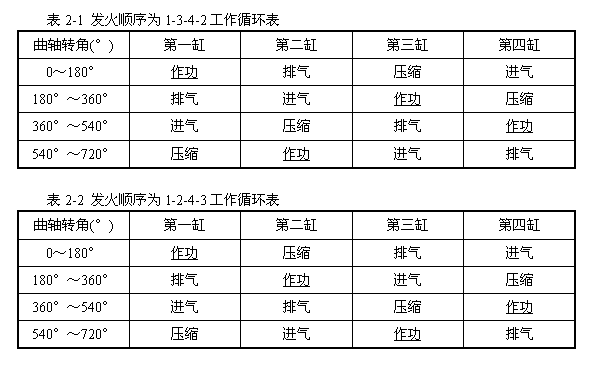 四缸四行程发动机的发火间隔角为720°/4=180°,曲轴每转半圈(180°)作功一次,四个缸的作功行程是交替进行的,并在720°内完成,因此,可使曲轴获得均匀的转速,工作平稳柔和。对于每一个气缸来说,其工作过程和单缸机的工作过程完全相同,只不过是要求它按照一定的顺序工作,即为发动机的工作顺序,也叫作发动机的发火顺序。可见,多缸发动机的工作顺序(发火顺序)就是各缸完成同名行程的次序。四缸发动机四个曲拐布置在同一平面内。1,4缸在上,2,3缸在下,互相错开180°,其发火顺序的排列只有两种可能,即为1-3-4-2或为1-2-4-3,两种工作顺序的发动机工作循环表分别见表2-1和表2-2。
