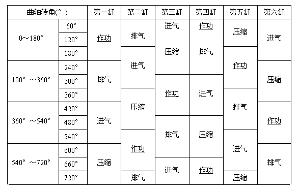 发火顺序为1-5-3-6-2-4发动机工作循环表。 |