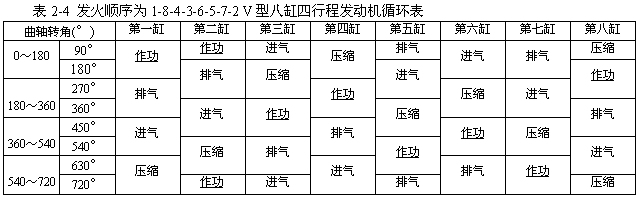 (3) 四行程V型八缸发动机的发火顺序,四行程V型八缸发动机的发火间隔角为720°/8=90°,V型发动机左右两列中对应的一对连杆共用一个曲拐,所以V型八缸发动机只有四个曲拐(图2-37)。曲拐布置可以与四缸发动机相同,四个曲拐布置在同一平面内,也可以布置在两个互相错开90°的平面内,使发动机得到更好地平衡。发火顺序为1-8-4-3-6-5-7-2。其工作循环表见表2-4。