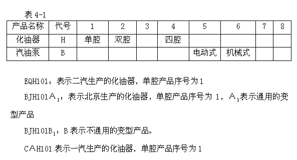 1985年,机械工业部颁发了部标《汽车化油器,汽油泵型号编制方法》(JB1672-84),规定了化油器、汽油泵的代号和参数,见表4-1