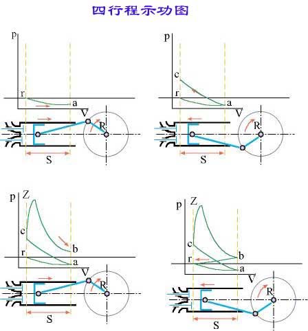排气行程 曲线br表示排气行程, 活塞从下止点向上止点运动,把废气强制排出到大气中去,活塞越过上止点后,排气门关闭,排气行程结束。排气终止(r)时,气体压力仍高于大气压力,约为0.105~0.115MPa,温度约为900~1200K。 |
