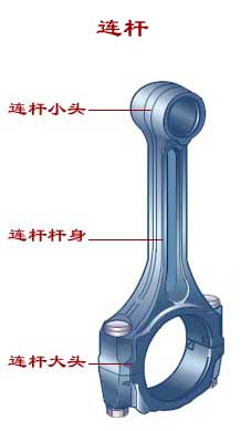 | 连杆的功用是连接活塞与曲轴。连杆分为三个部分:即连杆小头,连杆杆身和连杆大头(包括连杆盖)。 |