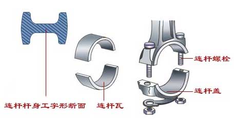 | 连杆杆身通常做成"I"字形断面,抗弯强度好,重量轻,大圆弧过渡,且上小下大。 |