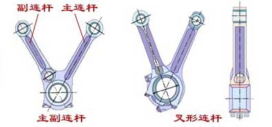 | 一列气缸的连杆为主连杆,其连杆大头直接装在连杆轴颈的全长上,另一列气缸的连杆为副连杆,其连杆大头与主连杆在头上的两个凸耳作铰链连接。称为主副连杆。 |