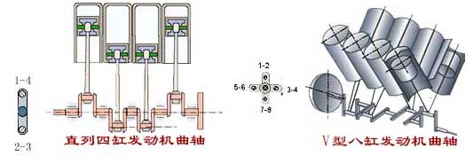 | V型发动机左右两列中对应的一对连杆共用一个曲拐,所以V型八缸发动机只有四个曲拐。曲拐布置可以与四缸发动机相同,四个曲拐布置在同一平面内,也可以布置在两个互相错开90°的平面内,使发动机得到更好地平衡。发火顺序为1-8-4-3-6-5-7-2。 |