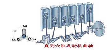 | 六缸发动机的发火顺序和曲拐布置, 六个曲拐分别布置在三个平面内,相互之间的夹角120°,发火顺序是1-5-3-6-2-4。 |