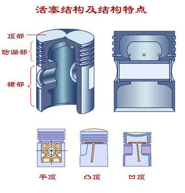 活塞可分为顶部、防漏部和裙部三部分。 活塞顶部承受气体压力,它是燃烧室的组成部分,有平顶、凸顶和凹顶活塞。 活塞头部指第一道活塞环槽到活塞销孔以上部分。它有数道环槽,用以安装活塞环,起密封作用,又称为防漏部。 活塞裙部指从油环槽下端面起至活塞最下端的部分,它包括装活塞销的销座孔。活塞裙部对活塞在气缸内的往复运动起导向作用,并承受侧压力。 |