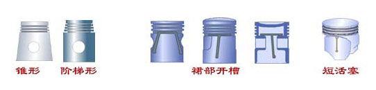 | 预先做成阶梯形、锥形:活塞沿高度方向的温度很不均匀,活塞的温度是上部高、下部低,膨胀量也相应是上部大、下部小。为了使工作时活塞上下直径趋于相等,即为圆柱形,就必须预先把活塞制成上小下大的阶梯形、锥形。 |