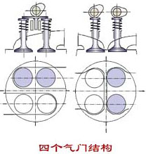 | 为了改善换气,在很多新型汽车发动机上多采用每缸四个气门结构。即两个进气门和两个排气门。 |
