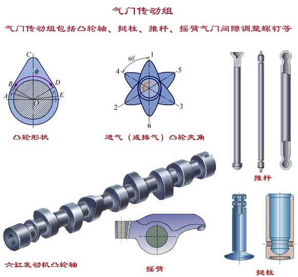 | 凸轮轴控制气门的开启和关闭,每一个进、排气门分别有相应的进气凸轮和排气凸轮。 |