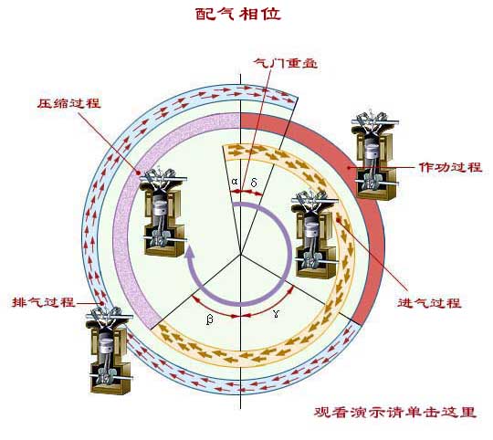 整个进气过程延续时间相当于曲轴转角180°+α+β=230°~290°。