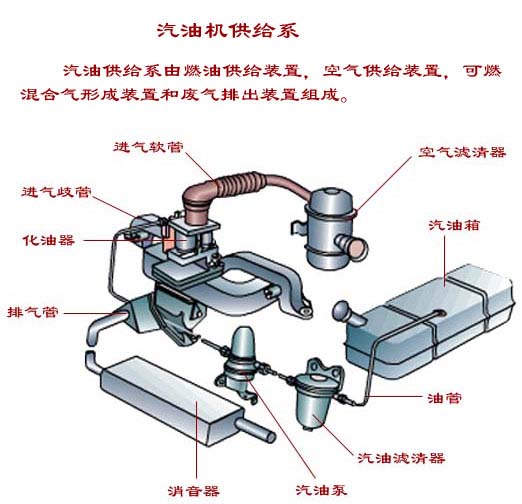 汽油泵将汽油从油箱吸出,经管路和汽油滤清器,然后泵入化油器浮子室,保证连续不断地供油。