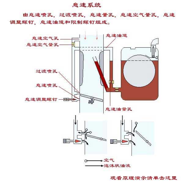 怠速时,发动机转速低,节气门开度很小,怠速喷孔设在节气门的后面。汽油经怠速量孔经油道上升,同来自空气量孔以及过渡喷孔的空气混合成泡沫乳剂从怠速喷孔喷出,并受到节气门边缘气流的吹散。