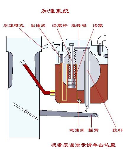 在浮子室内有一泵缸,泵缸内有活塞,活塞通过活塞杆及弹簧,连接板与拉杆相连。拉杆由固装在节气门轴上的摇臂操纵,加速泵腔与浮子室之间装有进油阀,泵腔与加速量孔之间油道中装有出油阀。 当节气门开度减小时,摇臂逆时针回转,带动拉杆、连接板、活塞杆及活塞向上移动,泵腔内产生真空度,汽油便自浮子室经进油阀充入泵腔。 但当节气门迅速地开大时,由于活塞下移很快,泵腔由压迅速增大,便进油阀关闭,同时顶开出油阀,泵腔内所贮存的汽油便从加速喷孔喷出,加浓混合气。这种加浓作用是一时的,当节气门停止运动后,即使保持的开度很大,加速泵也不再供油。 |