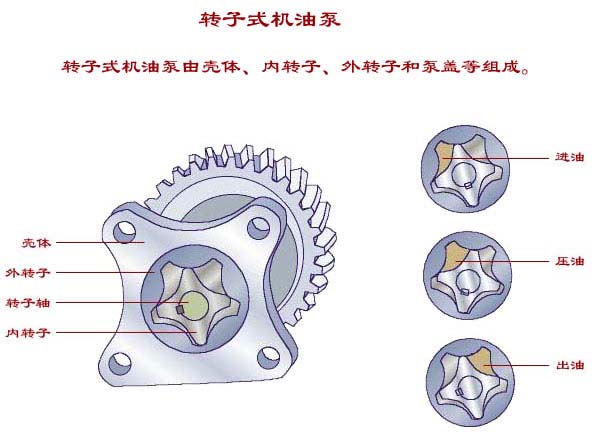 内转子用键或销子固定在转子轴上,由曲轴齿轮直接或间接驱动,内转子中心和外转子中心有偏心距,内转子带动外转子一起沿同一方向转动。