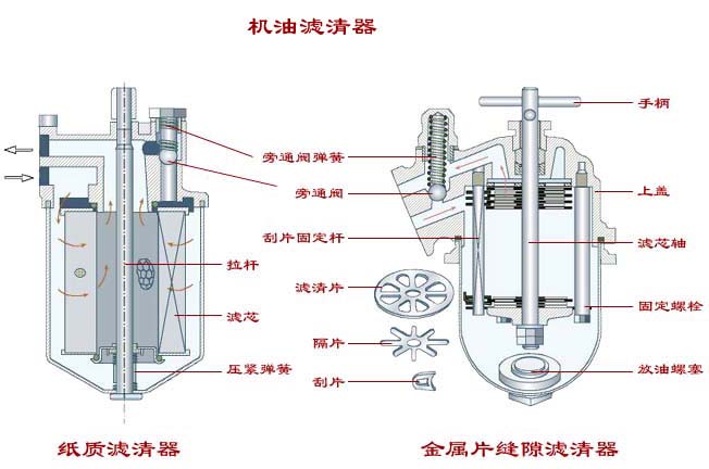 | 金属缝隙滤器的滤芯是由薄钢片制成的滤清片、隔片和刮片等组成。它们彼此相同地套在滤芯轴上,用上、下盖板及螺母压紧。由于滤清片之间有隔片,形成了一定的间隙,机油可通过此间隙流入滤芯,再经上盖出油道流向主油道,机油流动方向如图中箭头所示。在上盖设有旁通阀,当滤芯堵塞时,旁通阀被机油压力顶开,润滑油不经滤芯而直接流入主油道,保证供油不会中断。 |