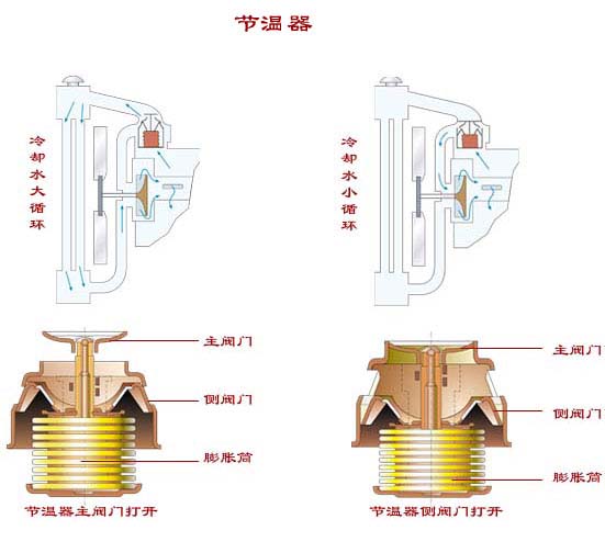 节温器的主阀门压在阀座上,即主阀门关闭,同时侧阀门打开,此时切断了由发动机水套通向散热器的水路,水套内的水只能由旁通孔流出经旁通管进入水泵,又被水泵压入发动机水套。