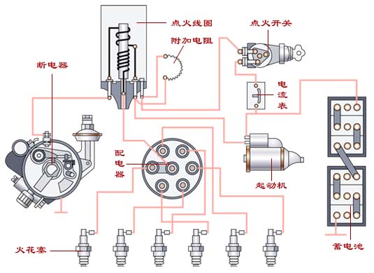 电源是蓄电池,其电压为12 V 或24 V ,由点火线圈和断电器共同产生高压10000 V 以上。分初级回路和次极回路。触点闭合时,初级电路通电,电流从蓄电池的正极经点火开关,点火线圈的初级绕组,断电器触点,接地流回蓄电池的负极,为低压电路。触点断开时,初级电路被切断,初级电路迅速下降到零,铁芯中的磁通随之迅速衰减以至消失,因而在匝数多,导线细的次极绕组中感应出很高的电压,使火花塞两极之间的间隙被击穿,产生火花。