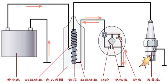 高压电路:当断电器凸轮顶开触点时,初级电路被切断,初级电路迅速下降到零,铁芯中的磁通随之迅速衰减以至消失,因而在匝数多,导线细的次极绕组中感应出很高的电压,使火花塞两极之间的间隙被击穿,产生火花。为高压电路。