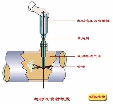 在柴油机进气管内安装一个喷嘴,起动液压力喷射罐内充有压缩气体。当低温起动柴油机时,将喷射罐倒立,罐口对准喷嘴上端的管口。轻压起动液喷射罐,将易燃气体喷入柴油机进气管,并随同进气管内的空气一起被吸入燃烧室,从而点燃喷入燃烧室的柴油。