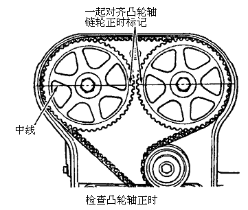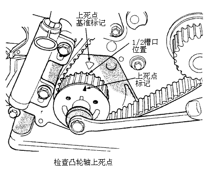 车 型:Caravan 2.4L 4缸 年 款:1996-1997 拆卸 注意:拆下正时皮带的情况下,凸轮轴或曲轴都不能被转动,否则可能损坏气门部件。在拆下正时皮带之前一定要对齐正时标记。 1.拆下1号火花塞。 2.将1号气缸置于压缩行程的上止点位置。拆下正时皮带上盖。检查凸轮轴链轮上的正时标记。 3.拆下: