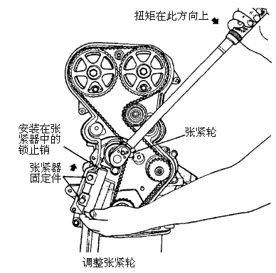 4.移动曲轴链轮到上止点位置以张紧皮带。安装张紧器到气缸体,但是不要拧紧螺栓。
