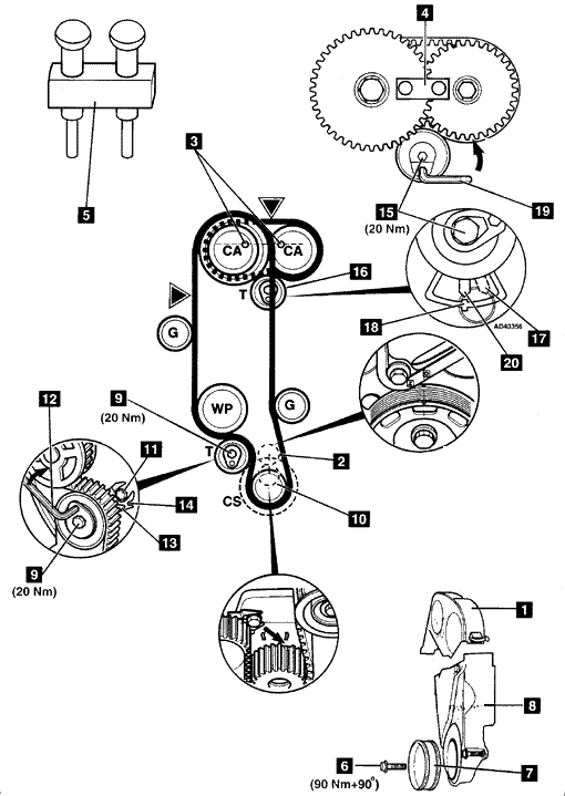 6.用手拧紧张紧器皮带轮螺栓15。 注意:确保底板上的凸起18位于气缸盖孔中。 7.逆时针转动张紧器直到指针20与底板上的凸起18对齐。 8.拧紧张紧器皮带轮螺栓15到20Nm。 9.如上所示安装正时皮带。 10.从凸轮轴链轮上拆下锁止工具5(如图中4所示)。工具号是T 10016。 11.顺时针转动曲轴2圈到1号气缸的上止点,确保曲轴链轮上的正时标记10对齐。 12.确保锁止工具5能插入凸轮轴链轮中(如图中4所示)。工具号是T 10016。 13.确保指针20与底板上的凸起18对齐。 14.如果没有对齐,重复张紧步骤。 15.在皮带的▼处用拇指压。指针20与底板上的凸起18应该彼此分开。 16.释放皮带▼处的拇指压力。 17.顺时针转动曲轴2圈到1号气缸的上止点。 18.确保指针20与底板上的凸起18对齐。 19.按照与拆卸相反的顺序安装部件。