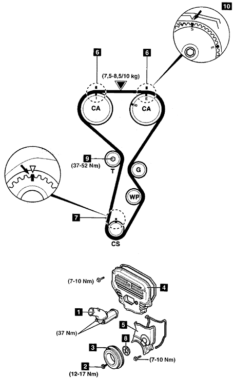 3.转动曲轴到1号气缸的上死点位置。确保正时标记6和7准确定位。 4.拆下曲轴链轮导向垫圈8。 5.松开张紧器螺栓9。 6.从皮带上移开张紧器。轻轻地拧紧螺栓9。 7.拆下正时皮带。 安装 1.确保正时标记6和7准确定位。 2.从曲轴链轮开始,逆时针方向安装正时皮带。确保链轮之间的皮带是张紧的。 3.松开张紧器螺栓9。顺时针方向转动曲轴两圈。确保正时标记6和7准确定位。 4.如果没有定位:重复安装和张紧步骤。 5.顺时针方向转动曲轴直到排气凸轮轴链轮上的‘S’标记和正时标记对齐(10)。 6.将张紧器螺栓9拧紧至37-52Nm。 7.在皮带的▼处施加10千克的载荷。皮带挠度应为7.5-8.5毫米。 8.按拆卸的相反顺序安装部件。 9.将曲轴皮带轮螺栓2拧紧至12-17 Nm。 10.重新加注冷却系统。