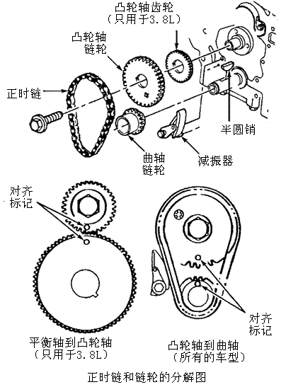 正时链和链轮 拆卸 1.拆下前盖。检查正时链和链轮是否磨损。正时链的内外移动量不应超过25.4毫米。如有必要,更换部件。 2.转动曲轴以使凸轮轴链轮和曲轴链轮上的正时标记对齐。拆下正时链减振器总成。拆下凸轮轴链轮螺栓并扔掉。拆下凸轮轴链轮和正时链。拆下曲轴链轮。见下图。