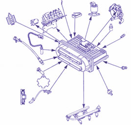 中间的金属方盒为电子控制单元,箭头指向电子控制单元的部件为传感器,箭头从电子控制单元出去的部件为执行器。