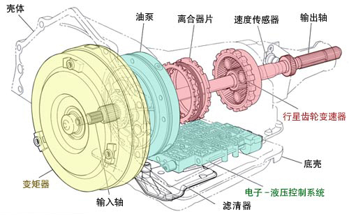 液力自动变速器由变矩器、机械式变速器(一般多采用行星齿轮)和电子-液压控制系统三部分组成。