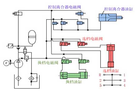 一般在变速器上交叉的安装两个控制油缸。图中显示的是5个前进档、一个倒档的双轴式变速器的换档执行机构。选档与换档由四个电磁阀根据ECU发出指令进行控制。