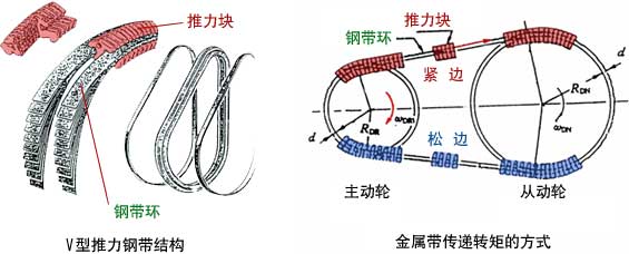 V型金属传动带由许多套在柔性钢带上具有V型侧面金属片组成,这种金属带传动,两个带轮间动力传递是靠作为推力块的金属片的推力实现的。