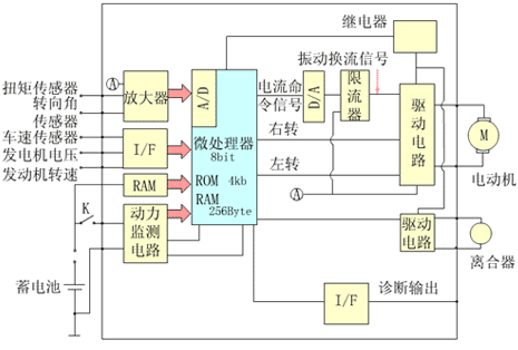 主要是速度控制和电动机电流控制。速度控制是当速度高于某一值时,系统应停止对电动机供电, 离合器处于分离状态,这时就按普通的转向控制方式工作。系统确定电动机电流的大小是按照汽车转向力矩和车速信号。当车速很低时,转向需要的助力大,此时供给电动机的电流值就应大;当车速接近45km/h时,转向需要的助力减少,此时供给电动机的电流值就应减少;当车速超过45km/h时,若无需助力,此时就应切断电动机的电流。