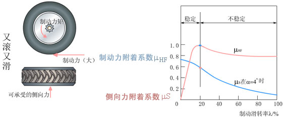 在非制动状态(滑动率为0)下,制动附着系数等于0;在制动状态下,滑动率达到最优滑动率时,制动附着系数最大,在此之前的区域为稳定区域;之后,随着滑动率的增大制动附着系数反而减少,侧向附着系数也下降很快,汽车进入不稳定区域,特别是当滑动率为100%时,侧向附着系数接近于0,也就是汽车不能承受侧向力,这是很危险的。所以应将制动滑动率控制在稳定区域内。附着系数的大小取决于道路的材料、状况以及轮胎的结构、胎面花纹和车速等因素。