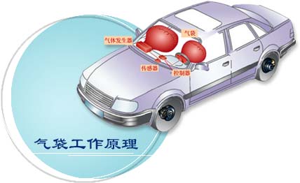 其工作原理为:传感器感受汽车碰撞强度并将其传给控制器,控制器进行判断并在适当时机发出点火信号触发气体发生器,气体发生器点火后迅速产生大量气体展开气袋。从而达到保护乘员生命安全的目的。