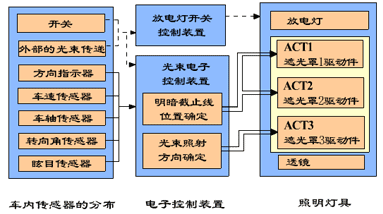 原 理:所有的开关信号和传感信号都输入电子控制装置。输入的信号数据通过电子控制装置转换成前照明系统中各灯具的光束控制数据。如果其中有一个灯具的光束需要控制,用来控制该灯具光束的控制数据就被转换,然后被送到该灯具,通过传动机构和开关控制电路送往该灯具的控制数据起动配光部件,按光束的要求进行调光,传动机构内装有一个电位计,该电位计向光束控制装置反馈传动机构的位移数据。