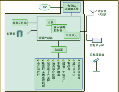 电子收费系统包括车载设备、车道设备、收费站计算机,整个系统典型结构图如图。