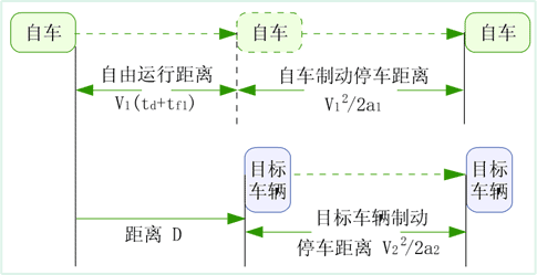 从两车速度判断,为避免追尾碰撞事故,测到的自车到目标车辆的距离必须大于安全距离。安全距离与两车的速度、减速度、驾驶员反应时间相关。