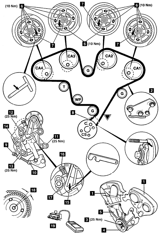 6.顺时针转动曲轴到设定位置。 7.把工具号是0187B的正时销插入到凸轮轴链轮 7。 8.拧松每个凸轮轴链轮的螺栓 6。 9.插入工具号是0187A的曲轴正时销 8。 10.把M8x1.25x75mm的螺栓插入到张紧器支架 9。 11.拧紧螺栓 9,直到它与支架 10接触。 12.拧松张紧器螺栓11,12和13。 注意:不要拧松螺栓 14。 13.安装专用工具 15。工具号是0187EZ 注意:如有必要,稍微拧松螺栓 9。 14.把M8x1.25x35mm的螺栓插入到张紧器支架 16。 15.拧紧螺栓 16,直到它与支架接触 17。 16.充分地拧紧螺栓 16。 17.拧松螺栓 9。 18.拆下正时皮带。 注意:如果皮带要重新使用,用粉笔在皮带上标记皮带的转动方向。 安装 1.确保曲轴正时销位置正确 8。工具号0187A。 2.确保凸轮轴链轮中正时销的位置正确 7。工具号0187B。 3.确保凸轮轴链轮能自由转动。 4.在槽形孔中,顺时针充分转动凸轮轴链轮。 5.拧紧螺栓 6到5Nm。 6.拧松螺栓45° 6 。 7.拧紧螺栓11,12和13到10Nm。 8.拧松螺栓45° 11、12和13 。 9.把正时皮带安装到曲轴链轮上。 10.使用工具号是0187J的专用工具,把正时皮带固定到位。 11.逆时针方向安装正时皮带。 注意:如果重新使用旧的皮带,注意皮带上的转动方向标记。 12.转动每个凸轮轴链轮,使它和最近的皮带齿啮合。 注意:确保螺栓没有在槽形孔的末端 6。链轮的转动角度不能多于1个皮带轮齿的范围 18。 13.确保皮带在链轮间被拉紧。 14.从正时皮带上拆下工具号是0187J的皮带固定夹。 15.在皮带的▼连接张力计。工具号是:SEEM C.Tronic 105.5 19。 16.拧入螺栓 9,直到张力计显示83±2 SEEM单位。 17.拧紧螺栓 11,拧紧力矩:10Nm。 18.拧紧螺栓 12,拧紧力矩:10Nm。 19.拧紧螺栓 13,拧紧力矩:10Nm。 20.使用工具号是0187F的工具,固定凸轮轴链轮。 21.拧紧凸轮轴链轮螺栓(CA1) 6。拧紧力矩:10Nm。 22.拧紧凸轮轴链轮螺栓(CA2) 6。拧紧力矩:10Nm。 23.拧紧凸轮轴链轮螺栓(CA3) 6。拧紧力矩:10Nm。 24.拧紧凸轮轴链轮螺栓(CA4) 6。拧紧力矩:10Nm。 25.拆下张力计 19。 26.从凸轮轴 7中拆下正时销。 27.拆下曲轴正时销 8。 28.顺时针慢慢转动曲轴2圈。 29.插入工具号是0187A的曲轴正时销 8。 30.拧松螺栓45° 11,12和13 。 31.拆下螺栓 16。 32.调整螺栓 9的位置,直到工具 15能够在没有间隙的情况下自由地滑动。工具号是0187EZ。 33.等待2分钟,使得自动张紧器装置和皮带位置稳定下来。 34.检查工具 15是否能在没有自由间隙的情况下自由地滑动。工具号是0187EZ。 35.必要时进行调整。 36.拆下专用工具 15。 37.拧紧螺栓 11,拧紧力矩:25Nm。 38.拧紧螺栓 12,拧紧力矩:25Nm。 39.拧紧螺栓 13,拧紧力矩:25Nm。 40.拆下螺栓 9。 41.拆下曲轴正时销 8。 42.慢慢地顺时针转动曲轴2圈。 43.插入工具号为0187A的曲轴正时销 8。 44.确保正时销能容易地插入凸轮轴链轮和从凸轮轴链中拔出 7。 45.必要时进行调整。工具号为0187F。 注意:确保螺栓没有在链轮槽形孔的末端 6。 46.拆下曲轴正时销 8。 47.拆下正时销 7。 48.按照与拆卸相反的顺序安装部件。 49.拧紧曲轴皮带轮螺栓 3。拧紧力矩:25Nm。