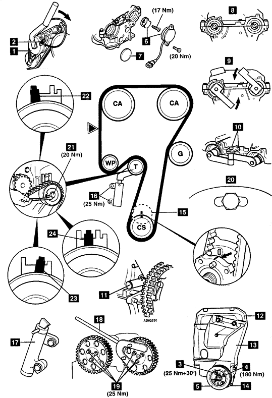机械型: 14.拧松张紧器螺母21。 15.顺时针转动张紧器,直到指针在左挡块22上。 16.轻微地拧紧螺栓21。 所有类型: 17.拆下正时皮带。 安装 液压型: 1.使用压力机,慢慢地把推杆压入张紧器壳体,直到孔对齐。把合适的销子穿过张紧器壳体上的孔,以固定推杆。(如图中17所示) 所有类型: 2.确保固定工具正确地安装。(如图中9和10所示) 3.确保曲轴上止点正销11的位置是正确的。 4.确保凸轮轴链轮正时标记15对齐。 5.使用工具号是Mot.799的工具18固定住凸轮轴链轮。拧松螺栓19。 6.使凸轮轴链轮与槽形孔中心的螺栓对齐。(如图中20所示) 7.从曲轴链轮开始,以逆时针的方向安装正时皮带。确保皮带在链轮间被拉紧。 液压型: 8.安装自动张紧器装置,拧紧螺栓16到25Nm。 9.从张紧器壳体中拆下销以释放推杆。(如图中17所示) 机械型: 10.拧松张紧器螺母21。 11.逆时针转动张紧器直到指针在右挡块23上。 12.顺时针转动张紧器直到指针处于中间位置24。 13.拧紧张紧螺栓21,拧紧力矩:20Nm。 所有类型: 14.使用工具号是Mot.799的工具固定住凸轮轴链轮18。拧紧螺栓19到25Nm。 15.拆下: