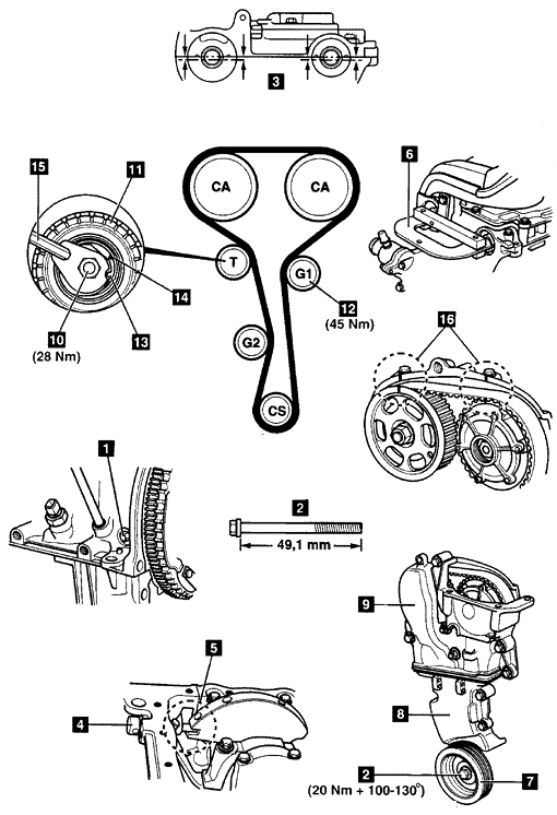 注意:不要让曲轴链轮离开曲轴。 安装 1.确保正时销4在曲轴中的位置是正确的。 2.确保凸轮轴中的槽对齐。(如图中3所示) 3.确保固定条6的安装是正确的。 4.安装新的导轮(G1)12。拧紧螺栓到45Nm。 5.安装新的张紧器皮带轮11。暂时地拧紧螺母10到7Nm。 注意:确保张紧器皮带轮后部的凸起位于气缸盖的槽中。 6.拆下曲轴链轮,去掉链轮上的油脂,去掉曲轴端部的油脂。重新安装曲轴链轮。 7.从凸轮轴链轮开始,以逆时针的方向安装正时皮带。确保皮带在非张紧侧被拉紧。 8.去掉曲轴皮带轮7上的油脂。 9.安装曲轴皮带轮 7。 10.测量曲轴皮带轮螺栓2的长度。最大长度:49.1mm,如果比最大长度长:使用新的螺栓。 11.安装曲轴皮带轮螺栓2。新螺栓:不润滑;用过的螺栓:润滑螺纹与接触表面。 12.暂时地拧紧曲轴皮带轮螺栓2。在螺栓接触表面与曲轴皮带轮7之间留2-3mm的间隙。 13.拧松张紧器螺母10。使用6mm的内六角扳手15,顺时针转动张紧器皮带轮直到张紧器标记13和14对齐。 14.暂时地拧紧张紧器螺母10。拧紧力矩:7Nm。 15.用大的螺丝起子锁止飞轮。暂时地拧紧曲轴皮带轮螺栓2。拧紧力矩:20Nm。 16.用漆或是粉笔在凸轮轴链轮和气缸盖上指示的地方做标记。(如图中16所示) 17.拆下: