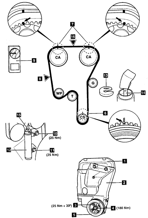 6.确保正时标记6和7都对齐。 7.从曲轴链轮起,按逆时针方向装配正时皮带。确保链轮之间皮带是张紧的。 8.从张紧器体拆下销以释放推杆。 9.在皮带▼标记16处施以指压。 10.在皮带▼标记8处施以指压。 11.将新的塑料垫圈装配到自动张紧装置13。 注意:垫圈的打孔侧应当朝上。 12.顺时针转动曲轴两圈到设定位置。 13.确保正时标记6和7都对齐。 14.安装: