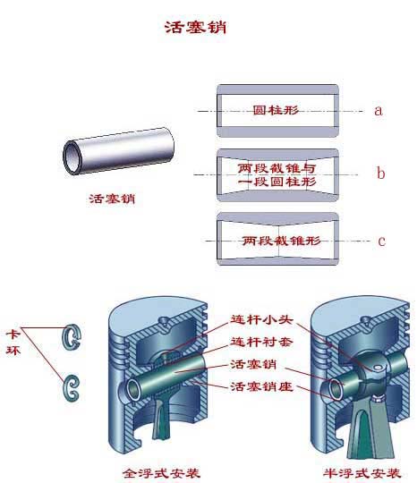| "全浮式"安装,当发动机工作时,活塞销、连杆小头和活塞销座都有相对运动,这样,活塞销能在连杆衬套和活塞销座中自由摆动,使磨损均匀。为了防止全浮式活塞销轴向窜动刮伤气缸壁,在活塞销两端装有档圈,进行轴向定位。 |