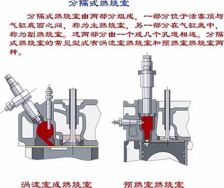 :缸盖上有予燃室,占燃烧室总容积的1/3,予燃室与主燃室有通道,活塞为平顶。因为通道不是切向的,所以压缩时不产生涡流。