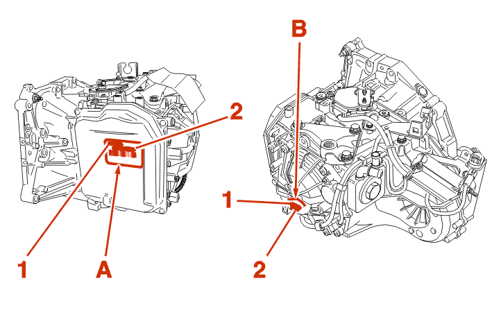 The automatic gearbox is identified by a self-adhesive label (A) or an engraving (B) :